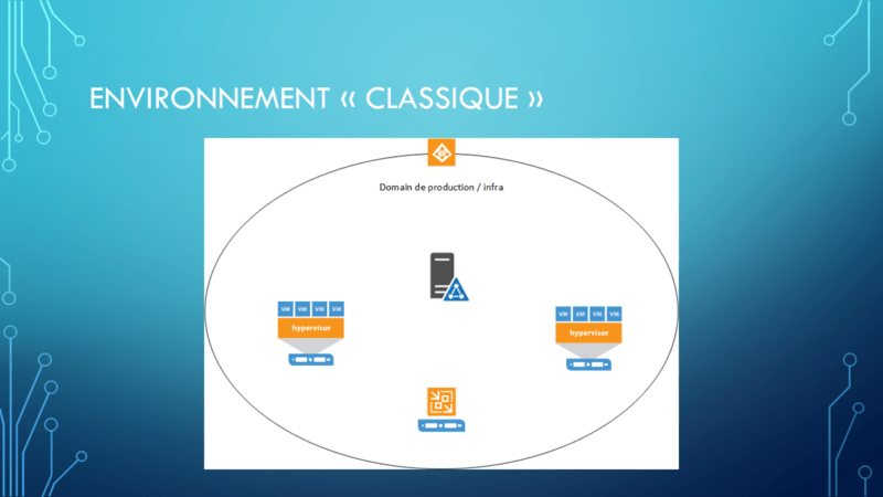 L’environnement dit classique, regroupe au sein d’une même foret Active Directory, l’ensemble des serveurs, qu’ils soient d’infrastructure comme les Hyperviseurs, la sauvegarde et l’environnement de production avec les serveurs de fichiers, messageries, base de données et progiciel.