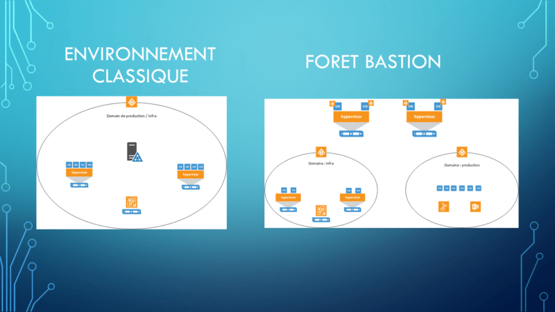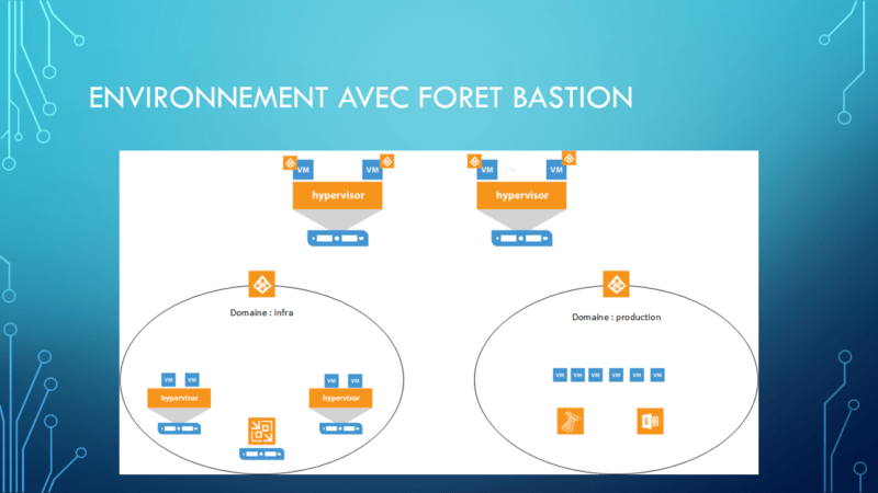 Ici, on peut voir un environnement avec une foret bastion pour l’infrastructure et un environnement Active Directory pour la production.