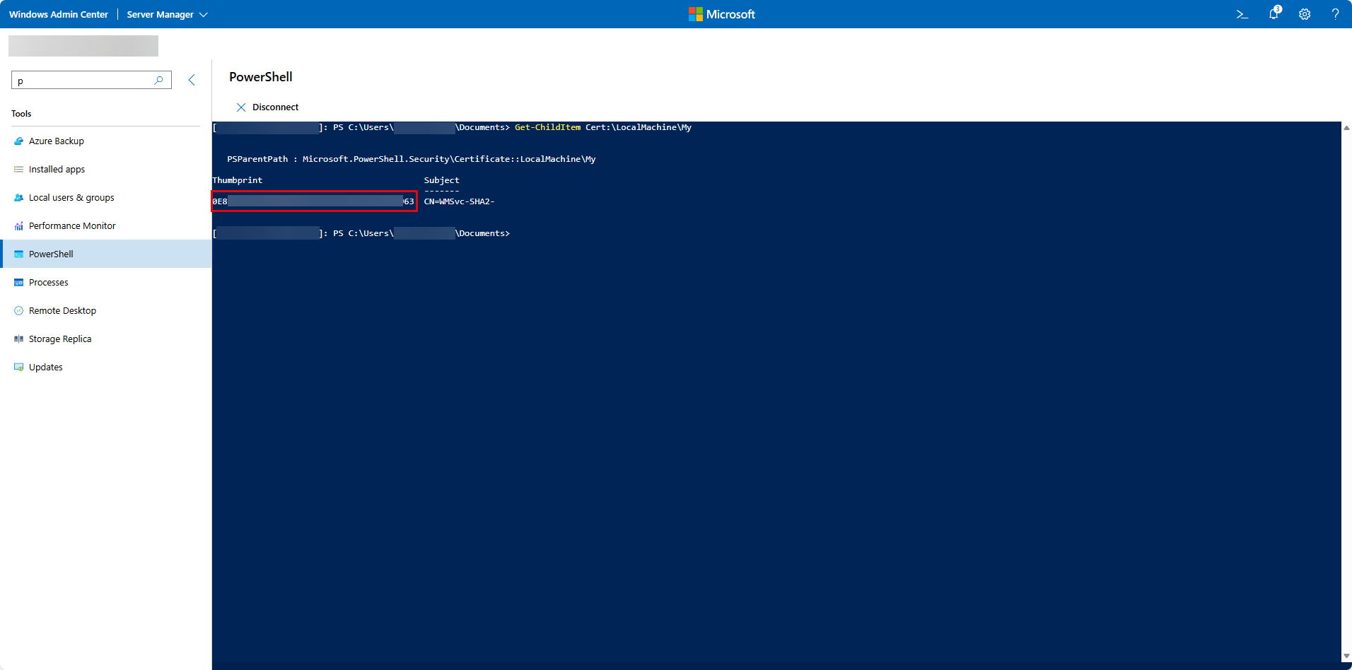 Pour commencer récupérer l’empreinte numérique (Thumprint) du certificat du service : WMSvc-xxxxx.