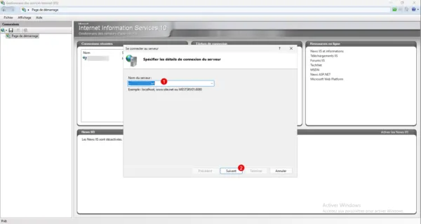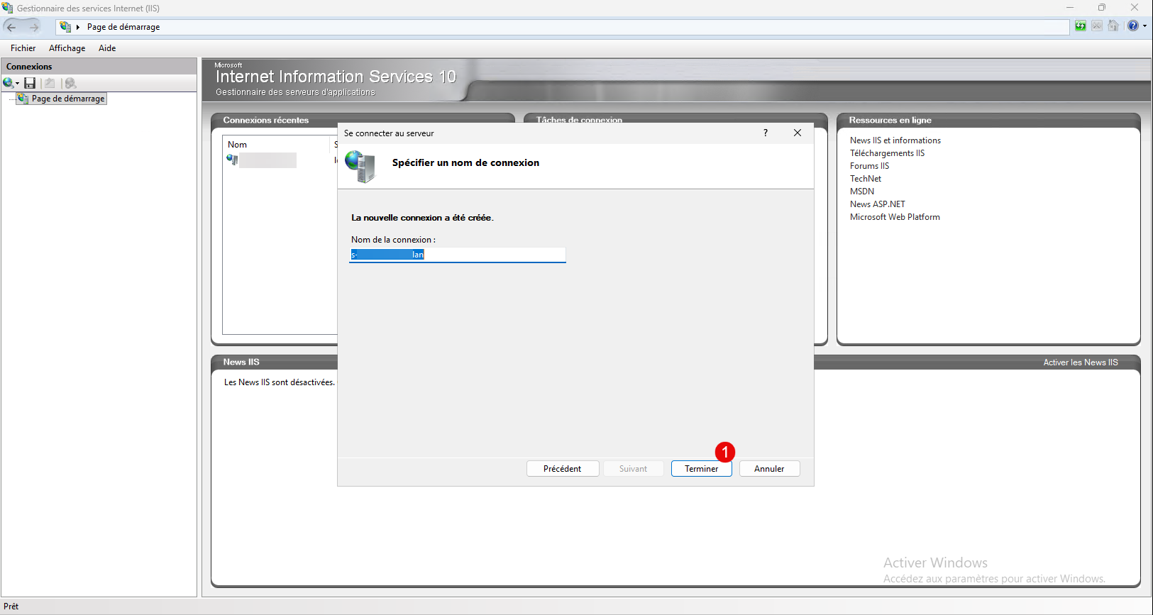Terminer l’ajout du serveur dans la console d’administration IIS en cliquant sur Terminer.
