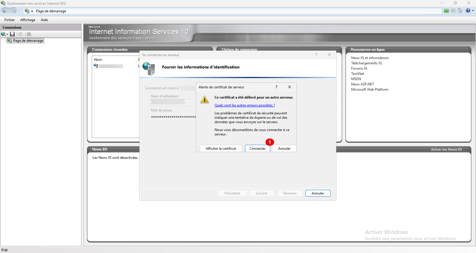 Valider l’alerte sur le certificat en cliquant sur le bouton Connecter.