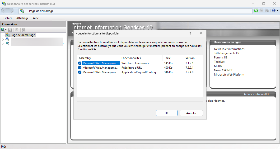 Pour ce qui ont l’œil, on peut voir que le serveur distant est un serveur IIS avec ARR d’installé, ce qui implique l’installation du ARR et du module Rewrite. Lors de la connexion au serveur, vous aurez un assistant qui va se lancer, qui va permettre l’installation des composants manquant pour le gestion à distance comme vous pouvez le voir ci-dessous :