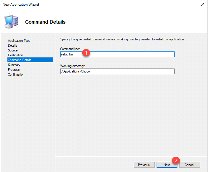 Dans le champ Command line, saisir setup.bat 1 puis cliquer sur le bouton Next 2.