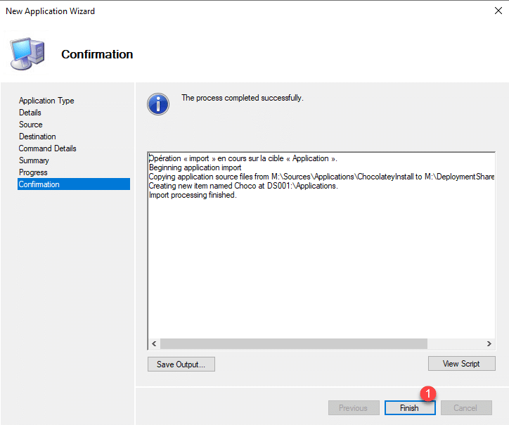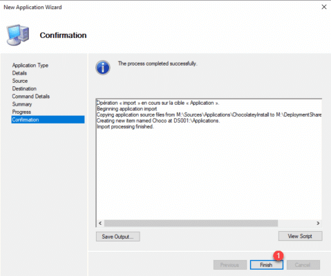 L’application qui permet l’installation de Chocolatey est créée, fermer l’assistant en cliquant sur Finish 1.
