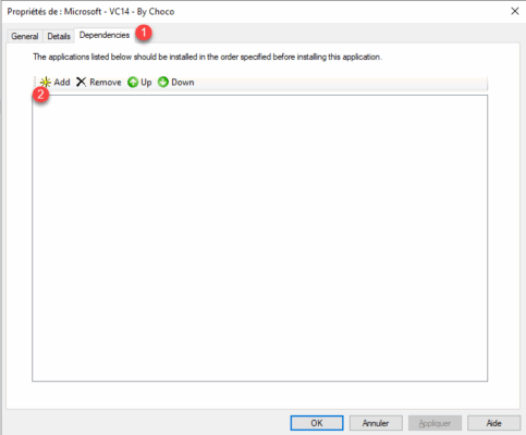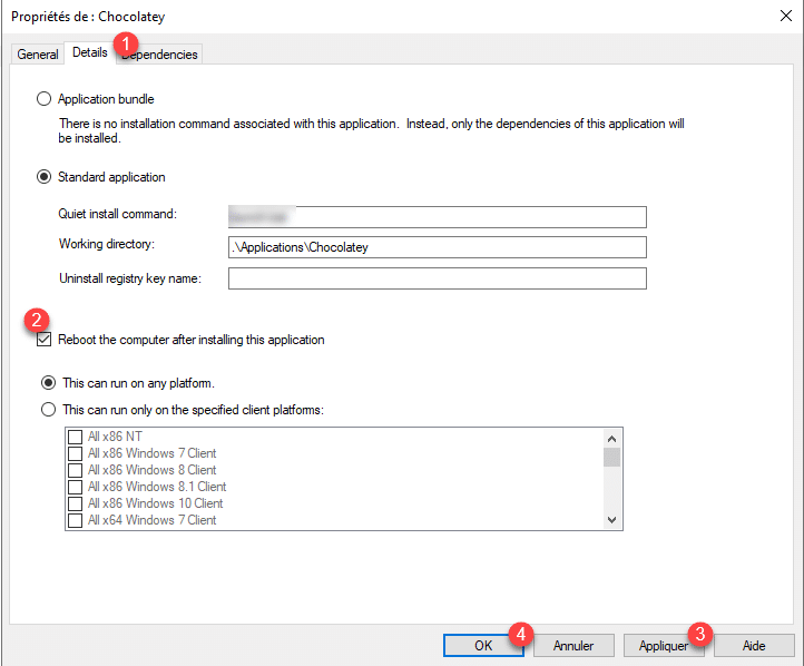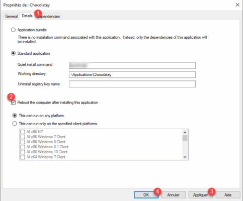 Ouvrir les propriétés de l’application Chocolatey (faire un double clique dessus), aller sur l’onglet Details 1, cocher la case Reboot the computer after installating this application 2 puis cliquer sur les boutons Appliquer 3 et OK 4.