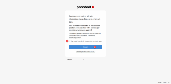 Enregistrer le fichier qui va permettre la récupération de votre compte, une fois cela fait, cocher la case : J’ai stocké mon de récupération … 1 et cliquer sur Suivant 2.