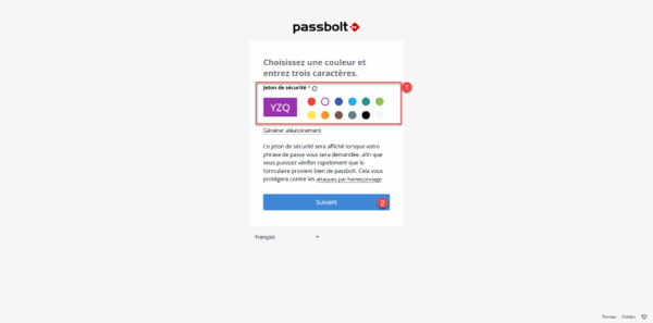 Configurer le jeton de sécurité 1, celui-ci à pour but de s’assurer que la demande saisir du mot de passe maitre vient bien de Passbolt, cliquer sur Suivant 2.