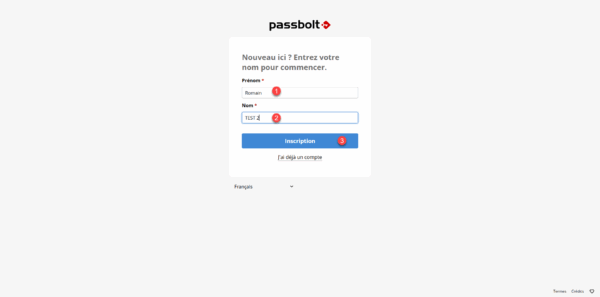 Ensuite, l’utilisateur saisie son prénom 1 puis son nom 2 et cliquer sur Inscription 3.