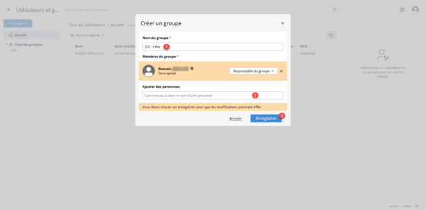 Entrer le nom du groupe 1, comme on peut le voir, mon utilisateur est ajouté au groupe en tant que Responsable, dès la création du groupe, vous pouvez ajouter des utilisateurs 2 en entrant leur nom et en sélectionnant le rôle, pour finir cliquer sur Enregistrer 3.