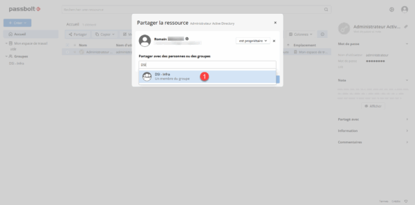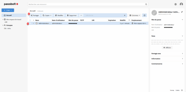 Pour partager un mot de passe dans un groupe, sélectionner le mot de passe 1 et cliquer sur Partager 2.