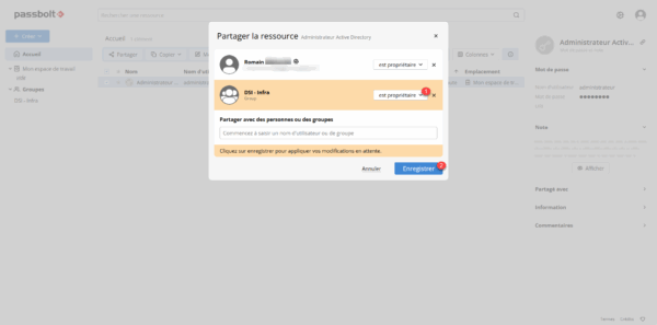 Oui cela est possible de partager un mot de passe avec un ou plusieurs utilisateurs sans passer par un groupe. Cela se passe comme pour le partage avec un groupe, il suffit de sélectionner un utilisateur à la place d’un groupe.