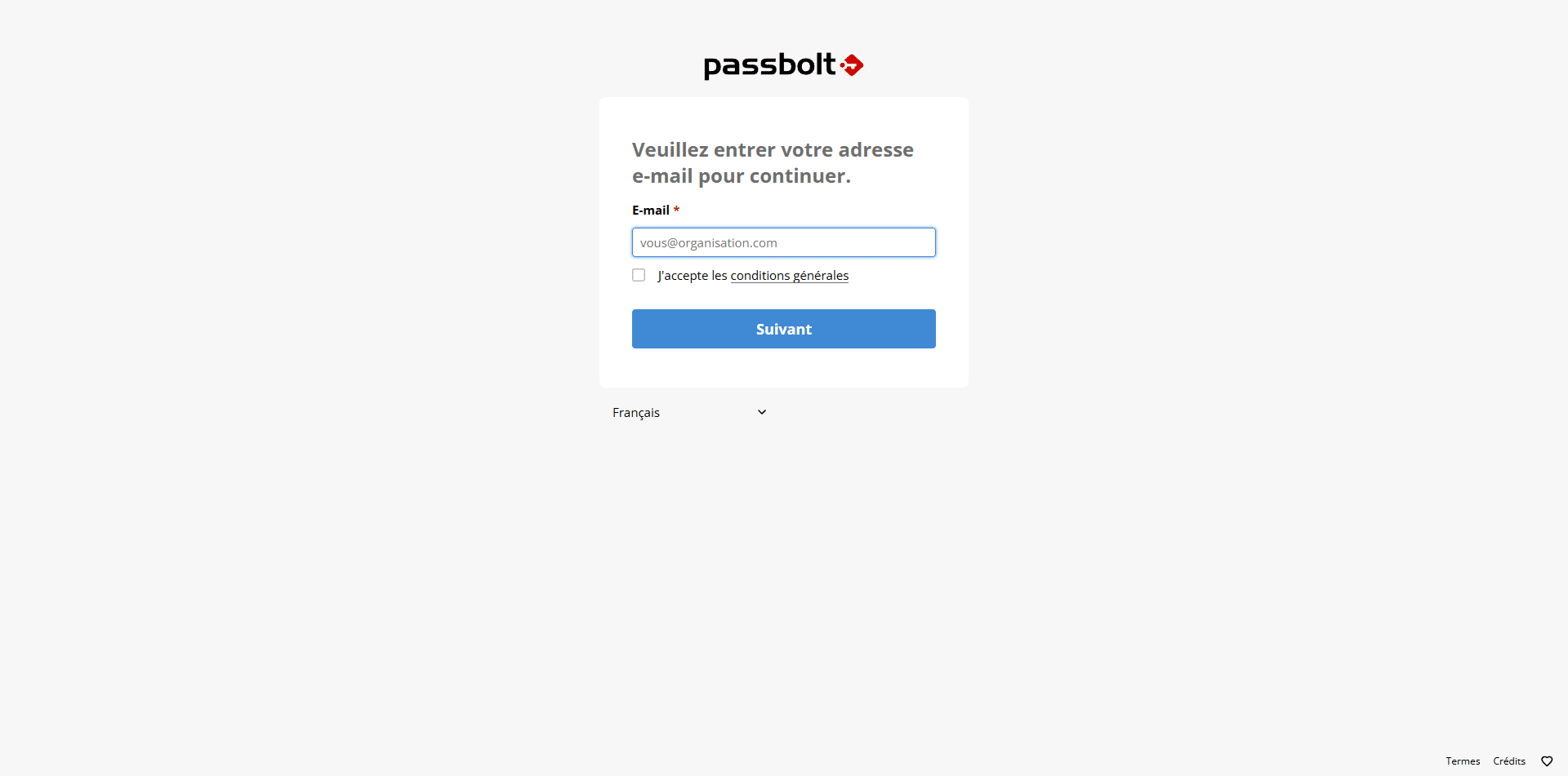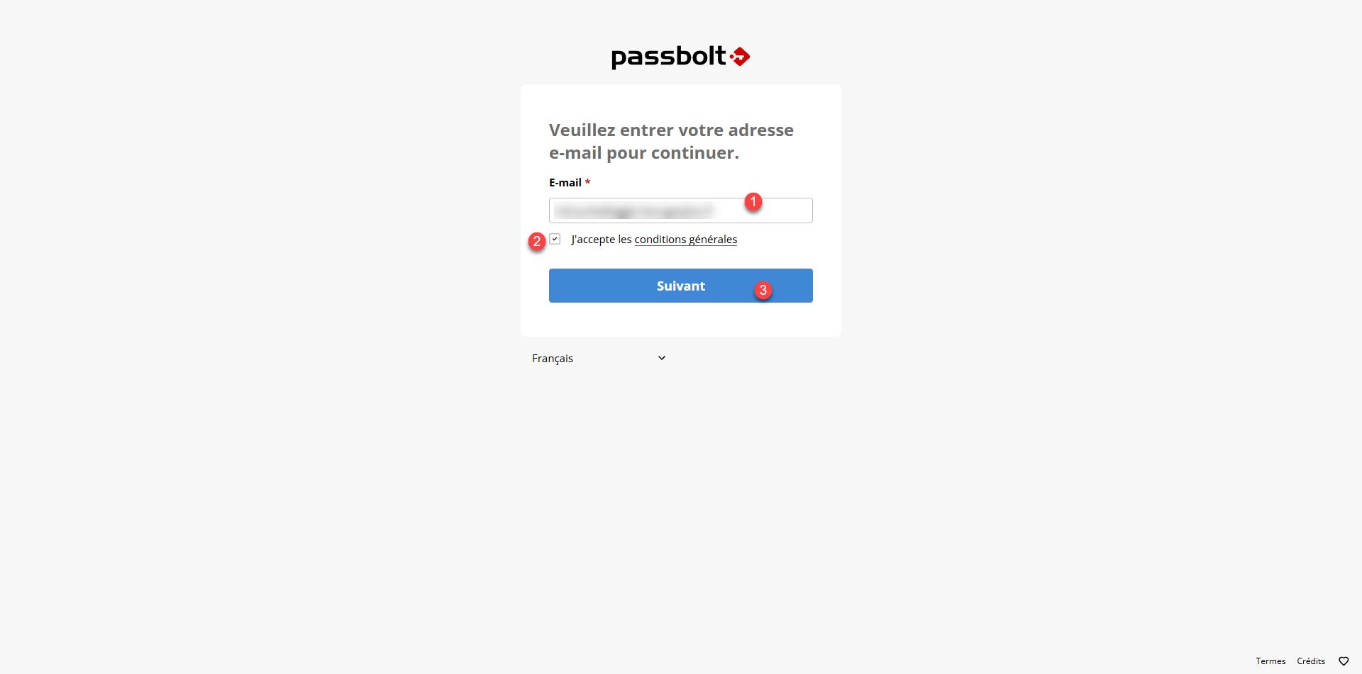 Il faut aller sur la page d’accueil de Passbolt : https://A.B.C.D ou https://passbolt.domain.tdl, sur la page de connexion, l’utilisateur entrer son adresse e-mail 1, coche la case : J’accepte les conditions générales 2 puis cliquer sur le bouton Suivant 3.
