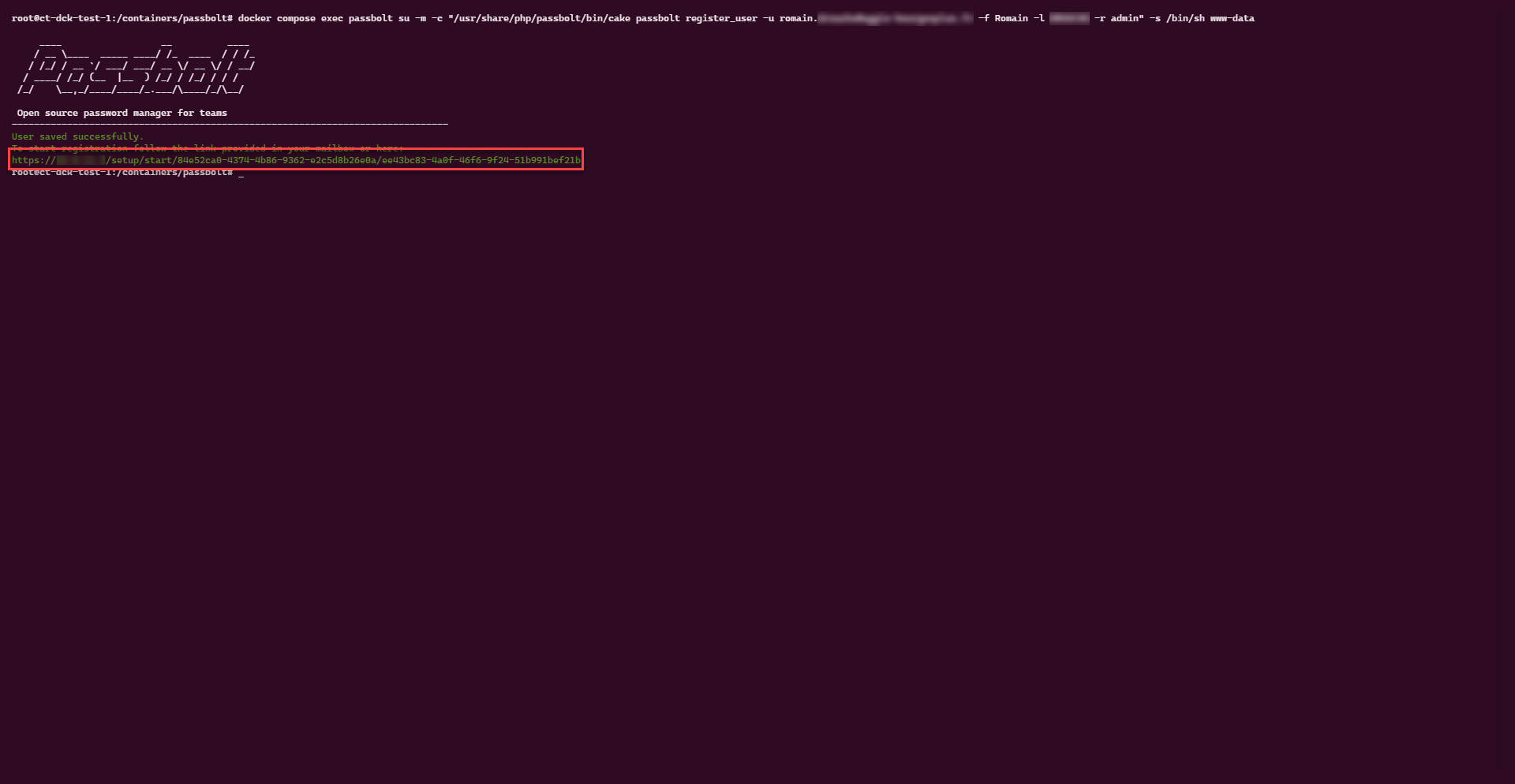 sudo docker compose exec passbolt su -m -c "/usr/share/php/passbolt/bin/cake passbolt register_user -u [email protected] -f Prenom -l NOM -r admin" -s /bin/sh www-dataLa commande va retourner un lien, copier le et l’ouvrir dans le navigateur :