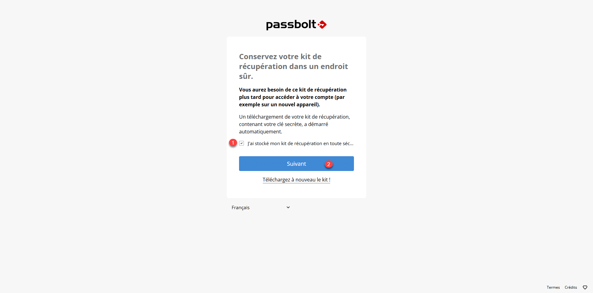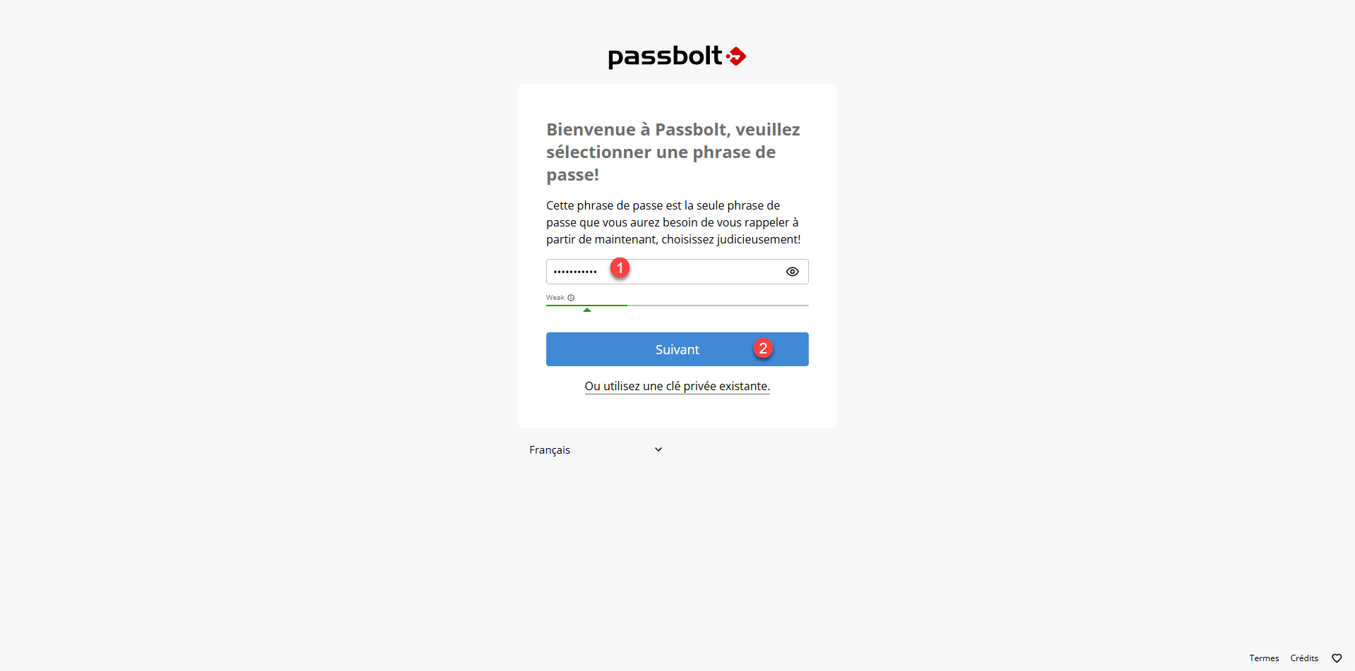 Entrer une phrase passe (mot de passe) 1 qui va permettre l’accès au gestionnaire de mot de passe et cliquer sur Suivant 2.