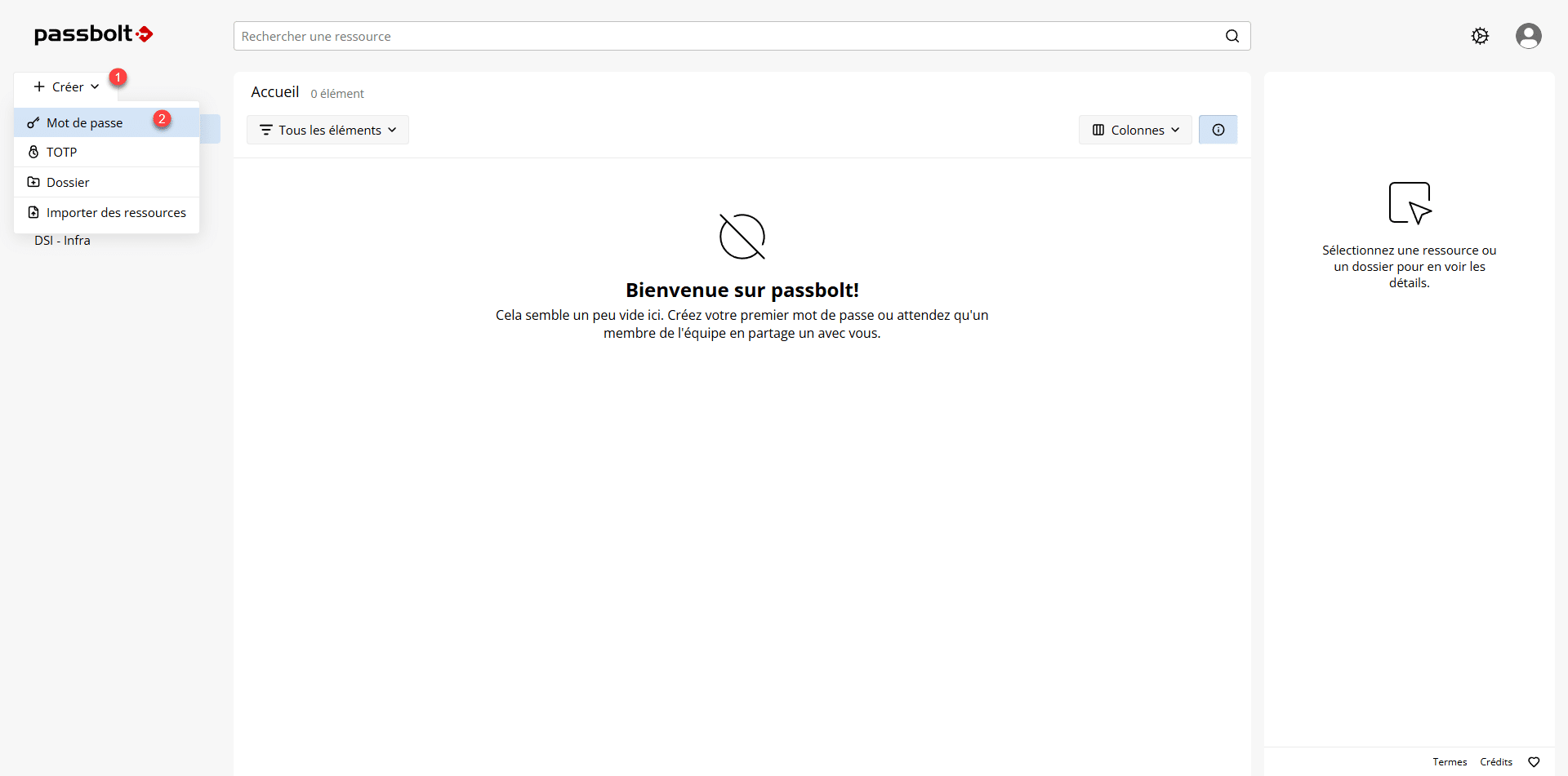 Pour commencer l’utilisation de Passbolt, on va voir comment créer un mot de passe dans Passbolt. Depuis l’interface Web, cliquer sur Créer 1 puis sur Mot de passe 2.