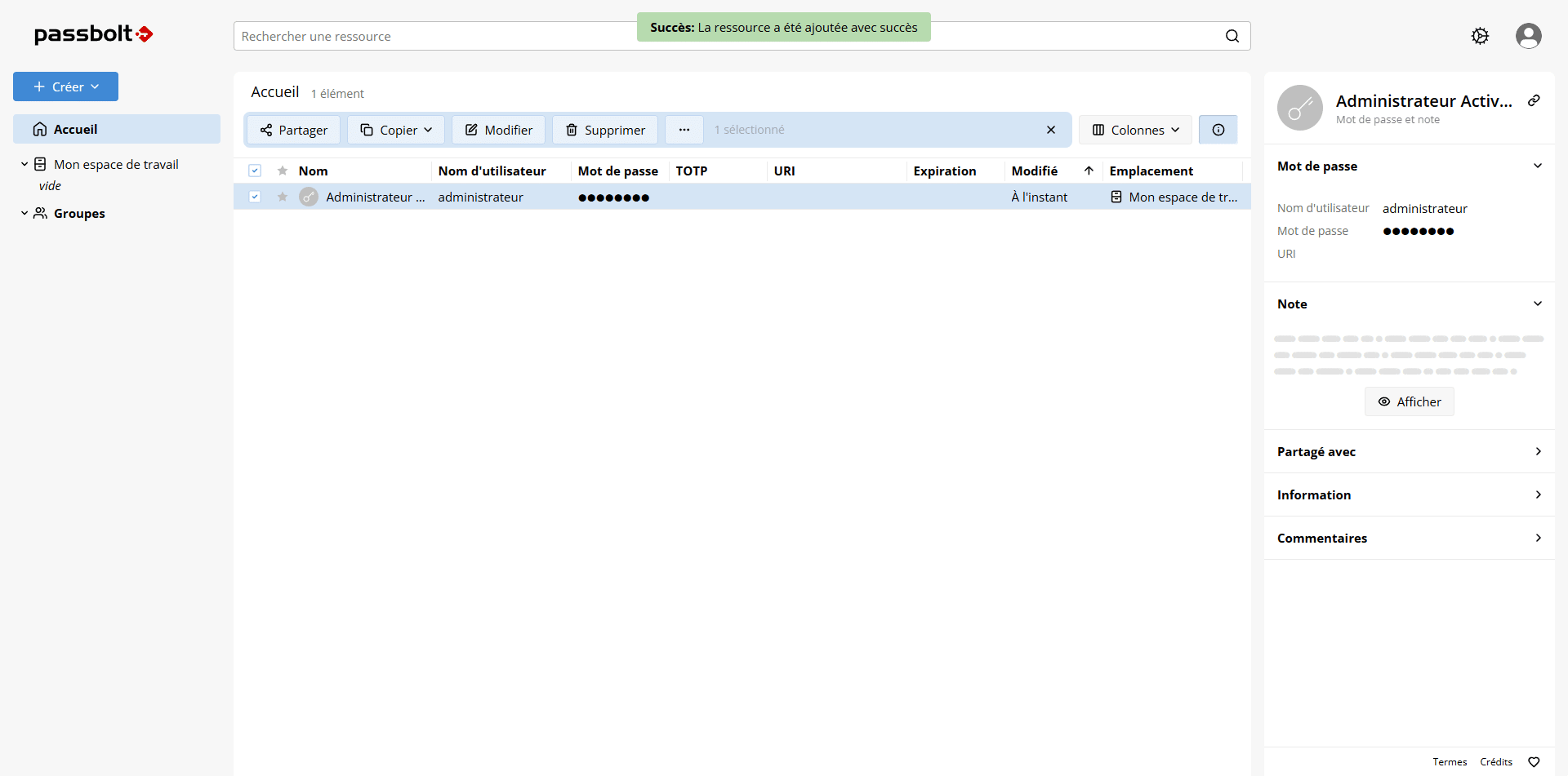 Le mot de passe est ajouté dans Passbolt.