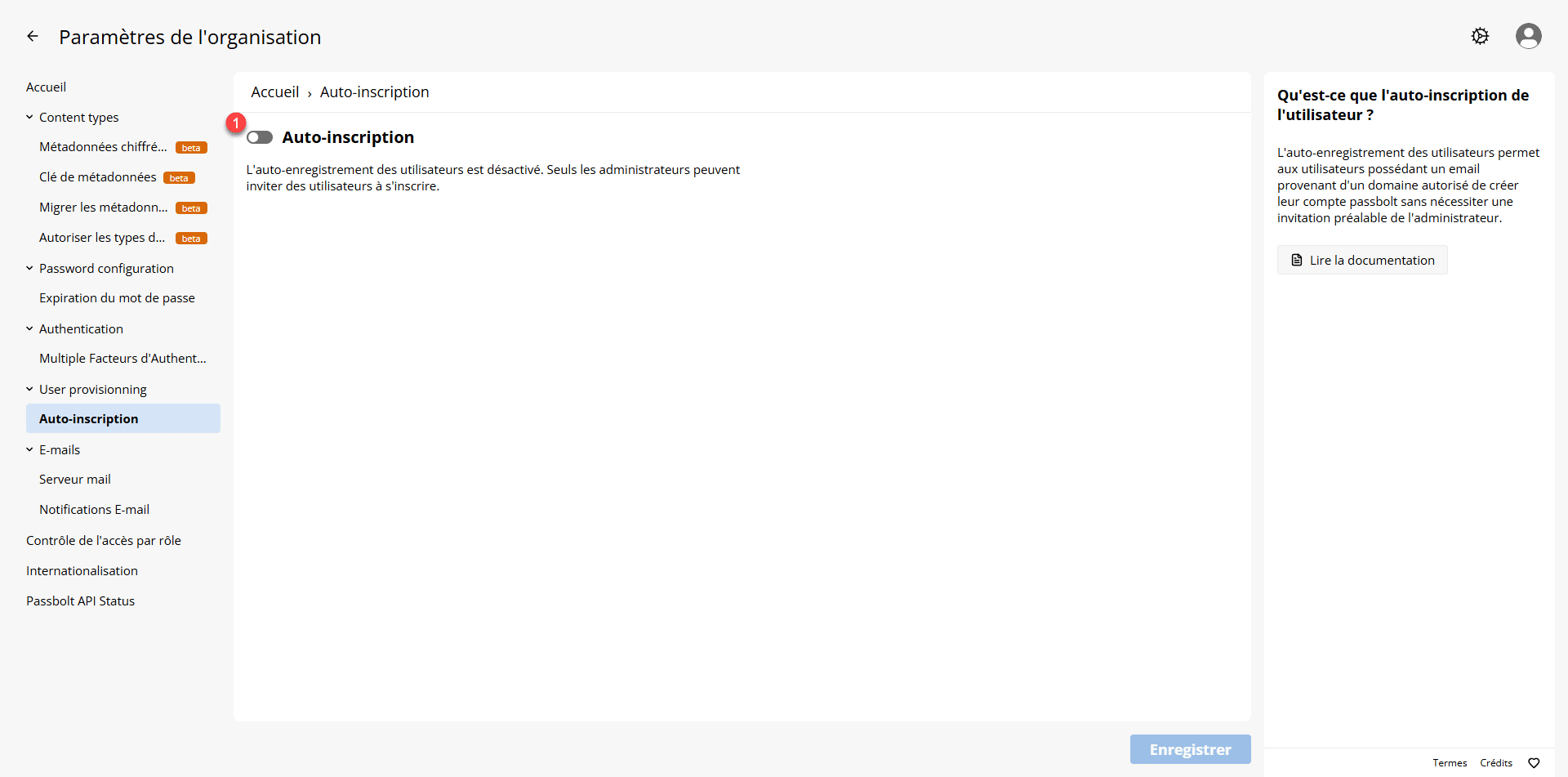 Par défaut l’auto-inscription n’est pas activé, cliquer sur le sélecteur 1.