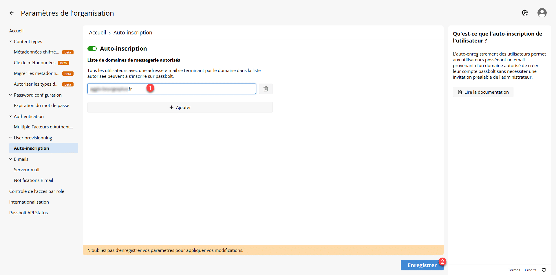 Lors de l’activation, le domaine de votre utilisateur est ajouté 1, il est possible d’en ajouter plusieurs en appuyant sur le bouton Ajouter, terminer en cliquant sur le bouton Enregistrer 2.