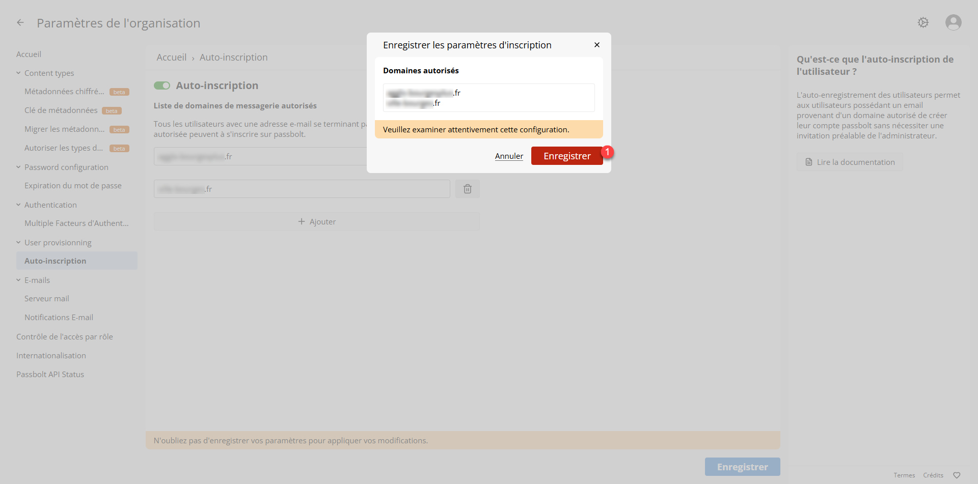 L’Auto-inscription dans Passbolt va permettre aux utilisateurs de votre entreprise de créer leur compte automatiquement dans le logiciel en se basant sur le ou les domaines de messagerie qui auront été autorisé.
