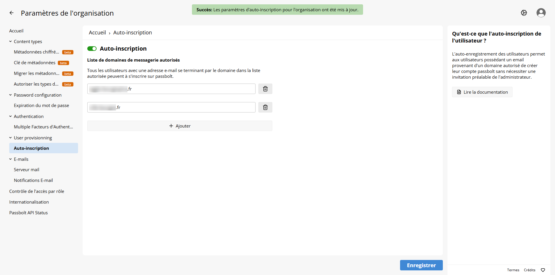 Les paramètres d’auto-inscription sont configurés.