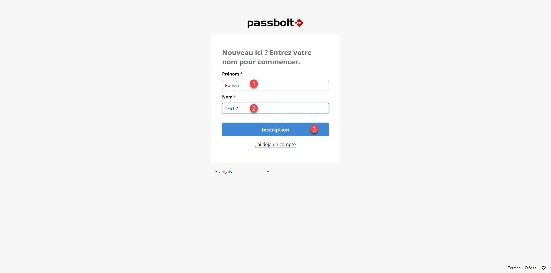 Ensuite, l’utilisateur saisie son prénom 1 puis son nom 2 et cliquer sur Inscription 3.