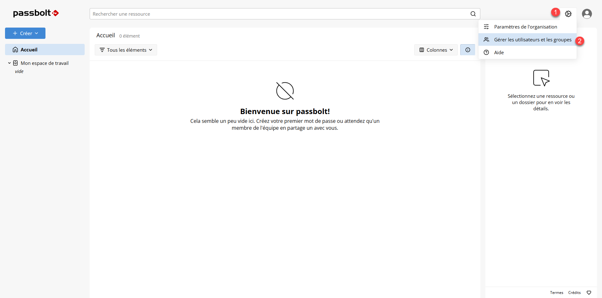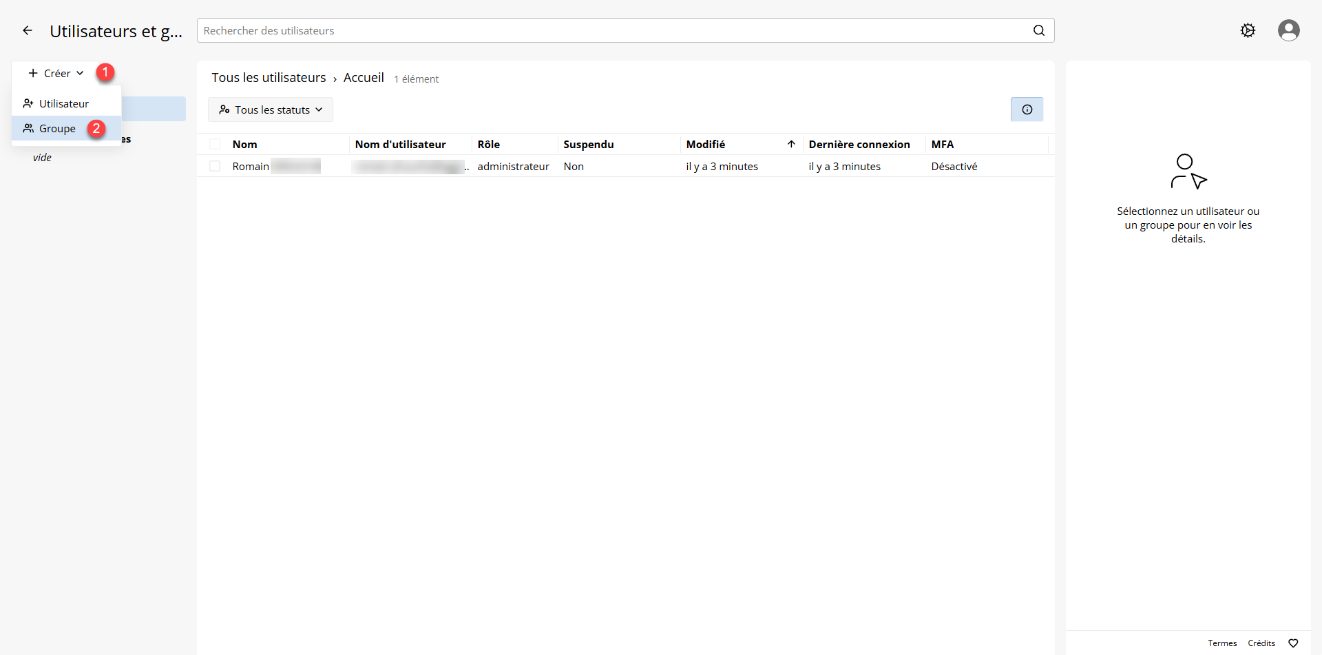 Pour accéder à la gestion des groupes, cliquer sur l’engrenage 1 puis sur Gérer les utilisateurs et les groupes 2.