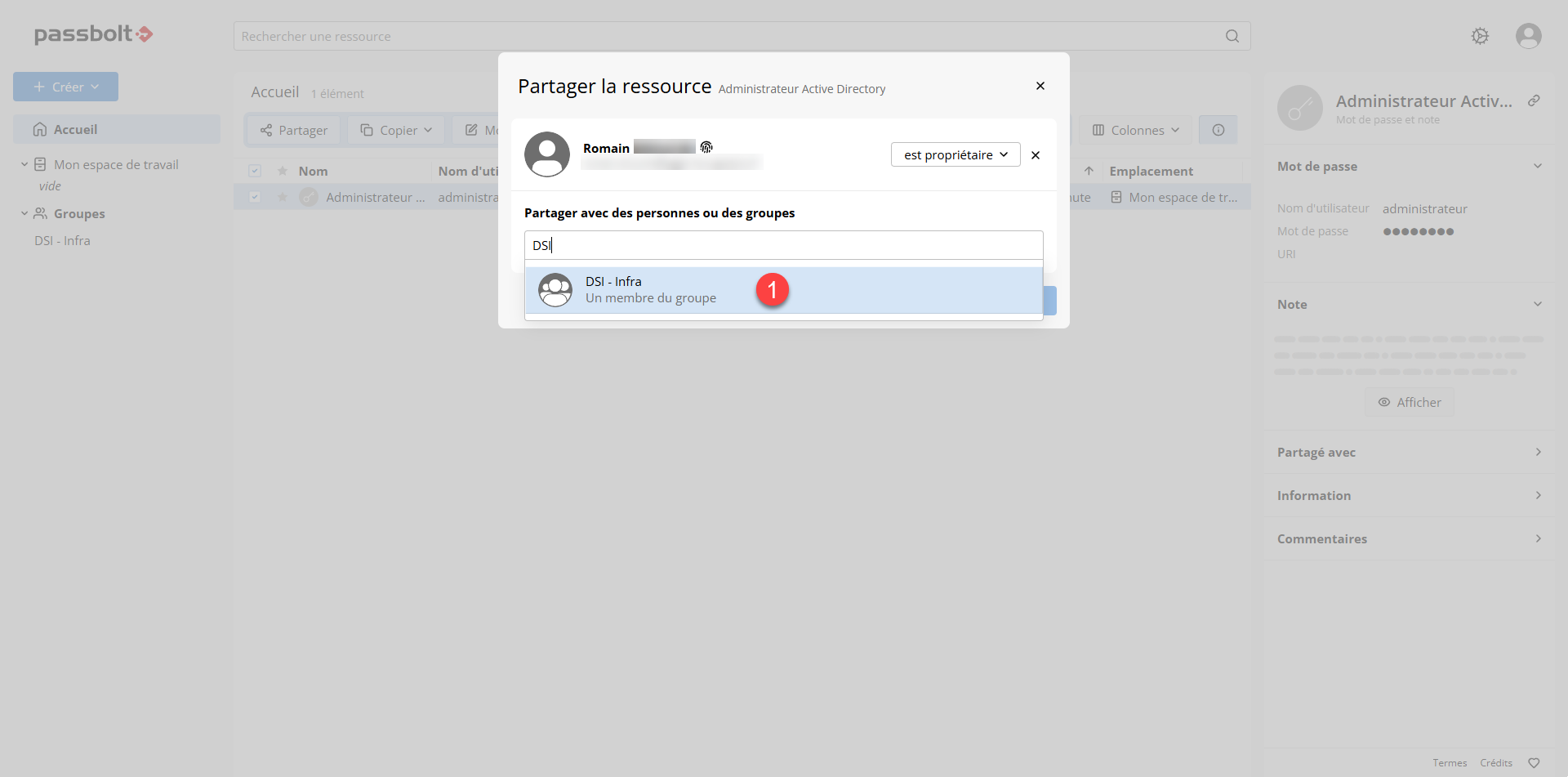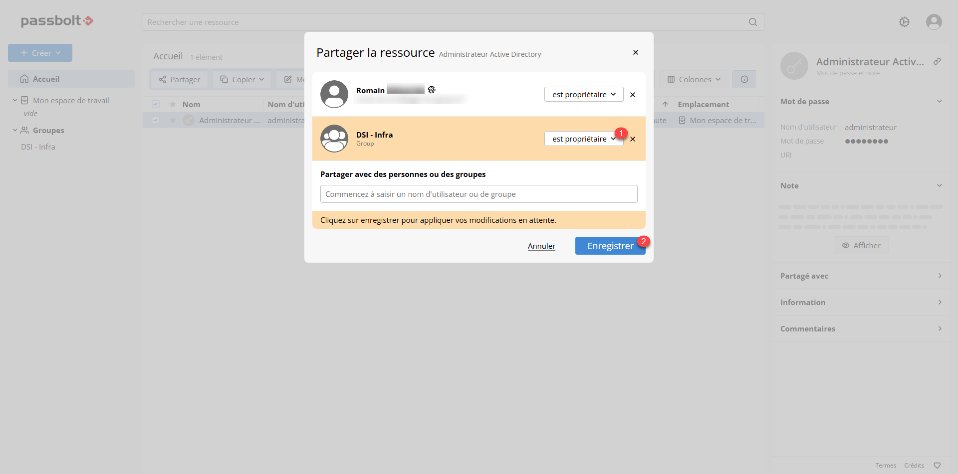Pour partager un mot de passe dans un groupe, sélectionner le mot de passe 1 et cliquer sur Partager 2.