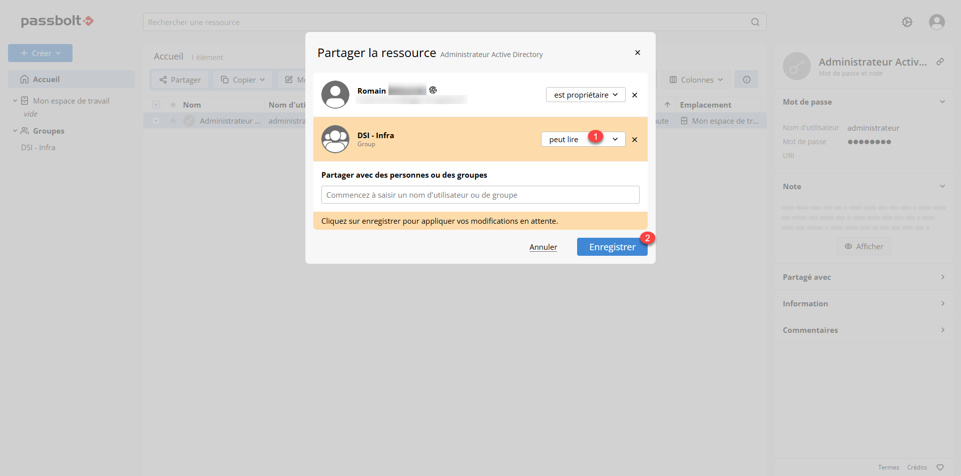 Sélectionner le droit du partage 1 et cliquer sur Enregistrer 2.