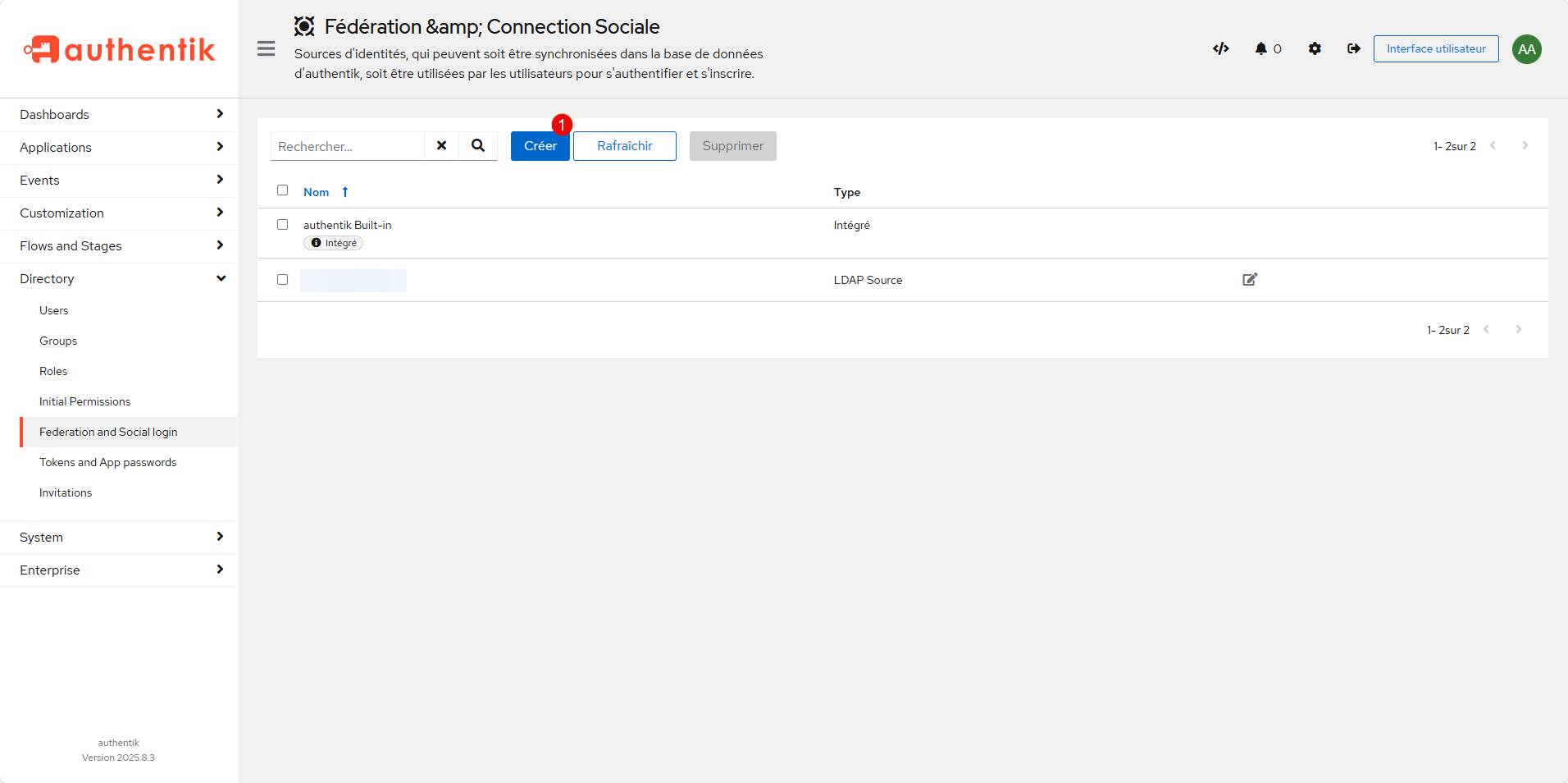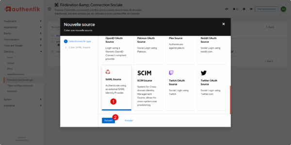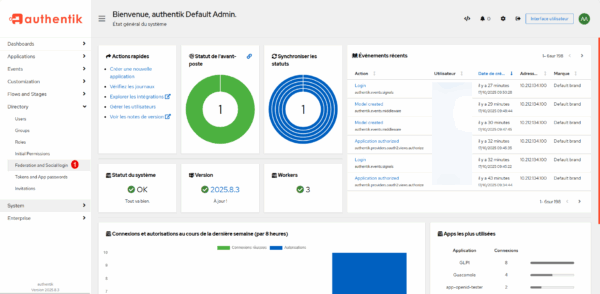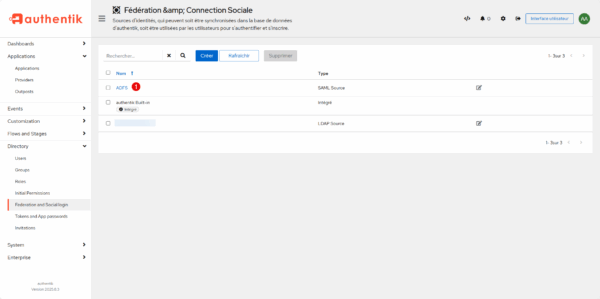 Depuis l’interface d’administration d’Authentik, déplier Directory et cliquer sur Federation and Social login 1.