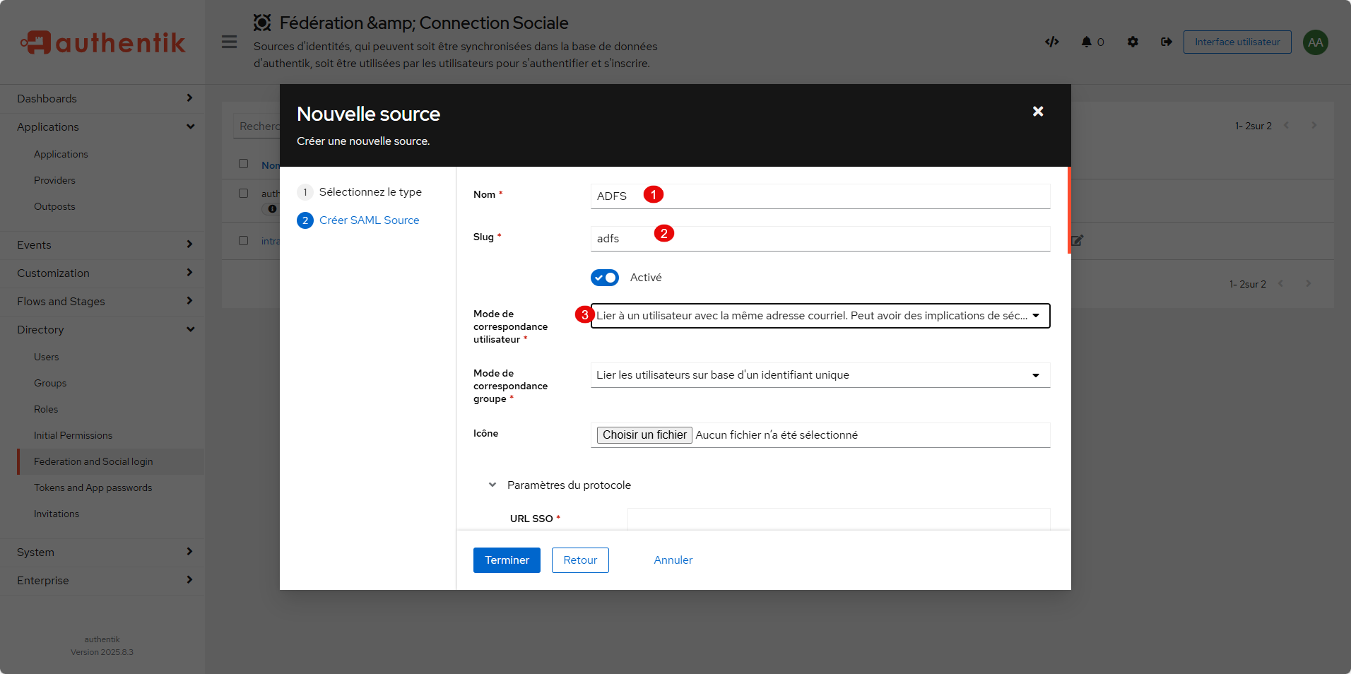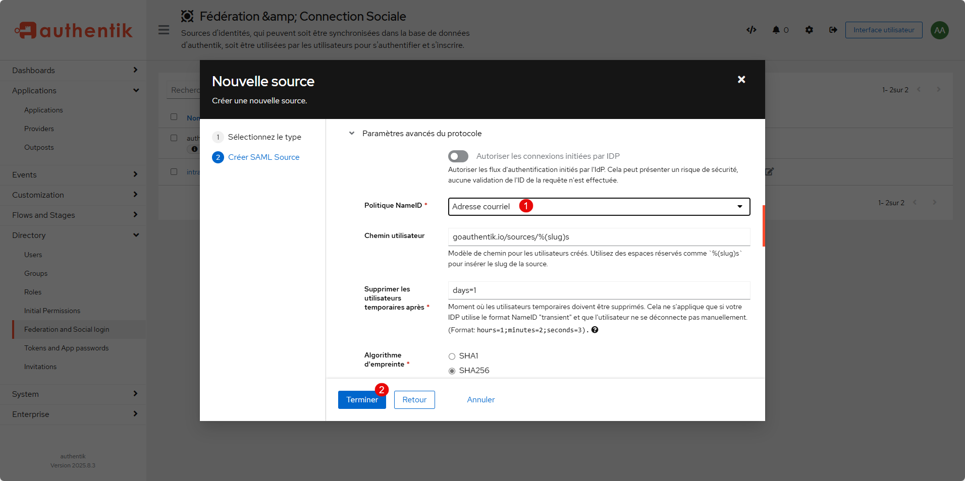 On continuer la configuration de la source SAML, dans les Paramètres avancés du protocole, sélectionner Adresse courriel 1 comme Politique NameID, pour finir cliquer sur Terminer 2.