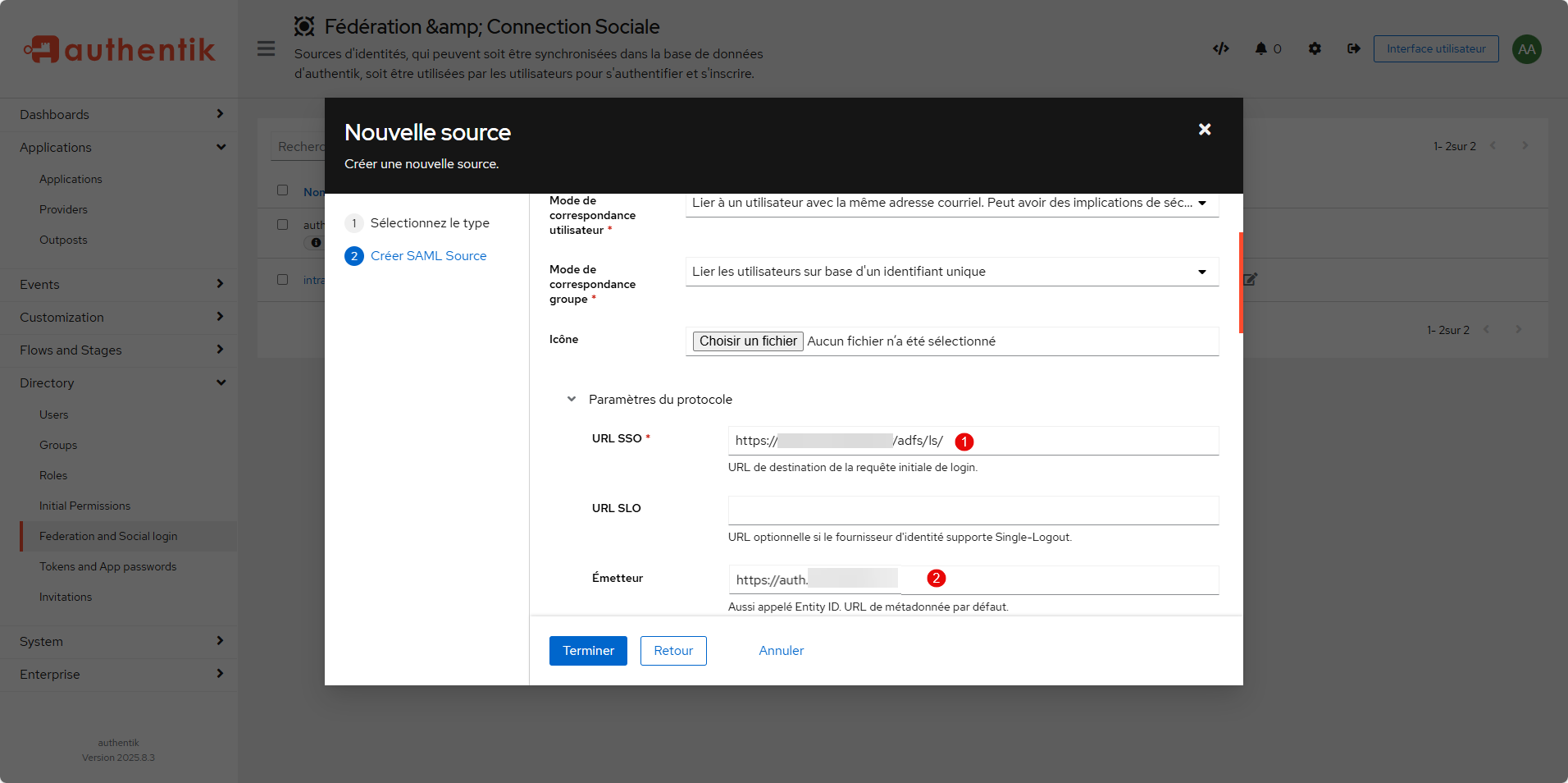 Ensuite, indiquer l’URL SSO du service ADFS 1 qui est généralement https://<adfs.domain.tld>/adfs/ls/, puis dans le champ Emetteur, entrer l’url d’Authentik 2.