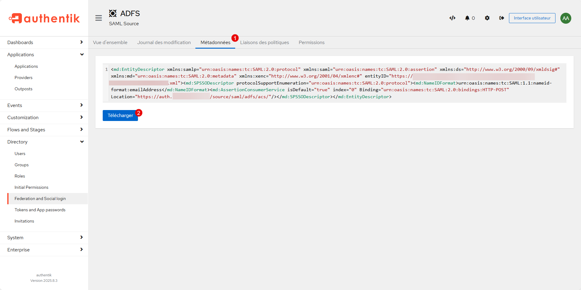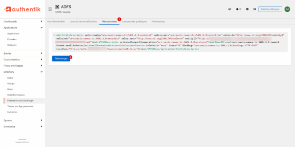 On va aller récupérer le fichier XML qui va permettre de configurer ADFS, aller sur l’onglet Métadonnées 1 et cliquer sur le bouton Télécharger 2 pour récupérer le fichier XML.