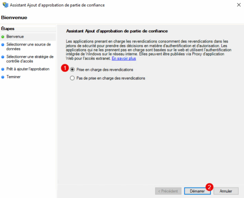 Au démarrage de l’assistant, choisir l’option : Prise en charge des revendications 1 puis cliquer sur le bouton Démarrer 2.