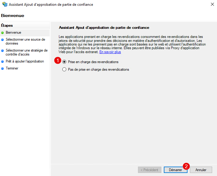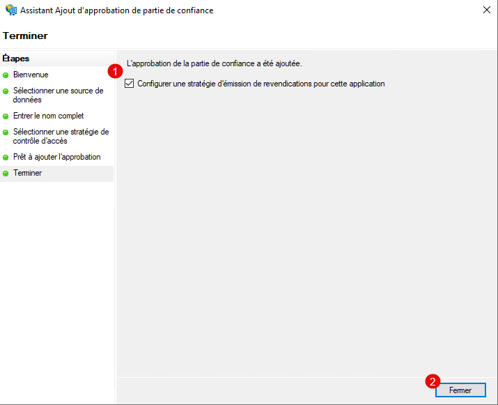 Laisser cocher la case : Configurer une stratégie d’émission de revendications pour cette application, cliquer sur Fermer 1.