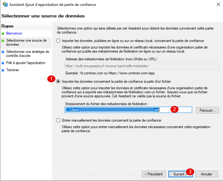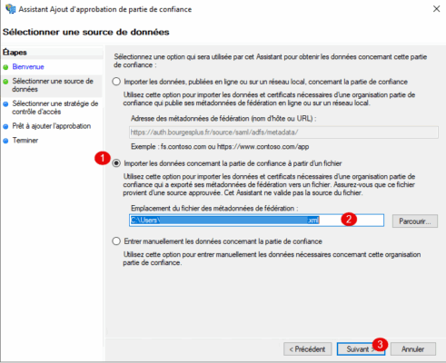 Choisir l’option : Importer les données concernant la partie de confiance à partir d’un fichier 1, sélectionner le fichier 2 et cliquer sur Suivant 3.