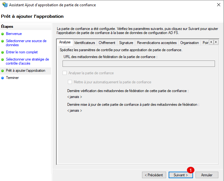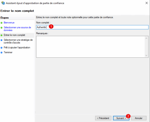 Entrer un nom 1 pour l’Approbation de partie de confiance et cliquer sur Suivant 2.
