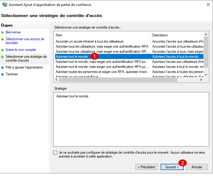 Comme Authentik permet de gérer les autorisations en interne, sélectionner Autoriser tout le monde 1 et cliquer sur Suivant 2.