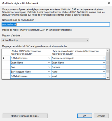 Vérifiez que les attributs et revendications SAML, notamment l’email et le groupe, sont correctement mappés dans Authentik. L’ajout du claim email dans ADFS est souvent nécessaire.