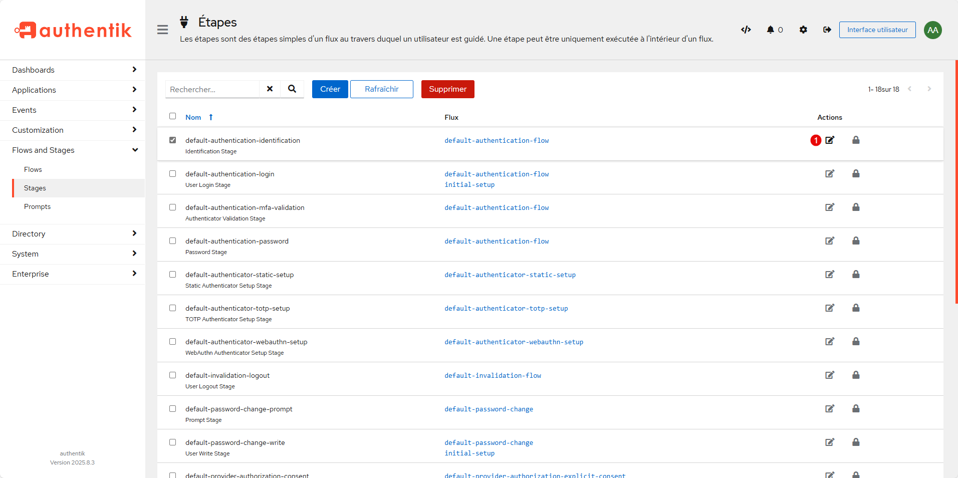 Aller sur la liste des Etapes (Flow) et cliquer sur le bouton de modification de : default-authentification-identification 1.