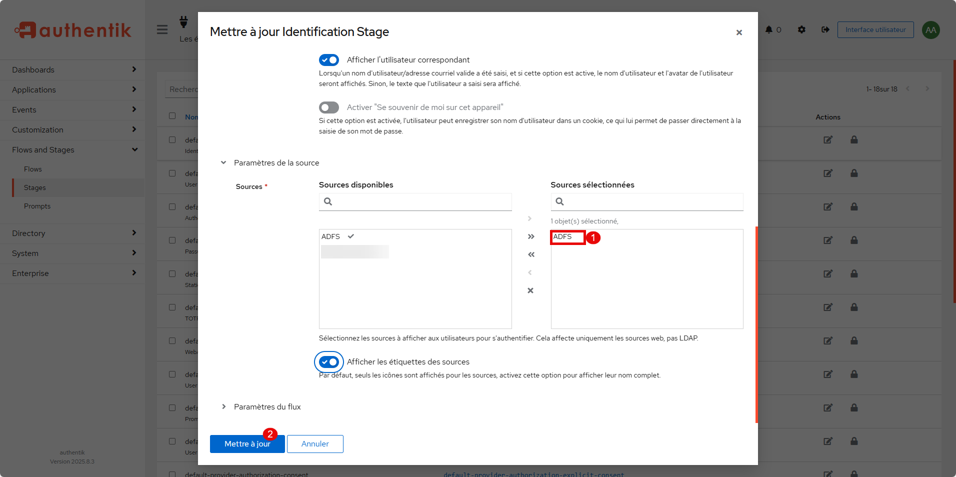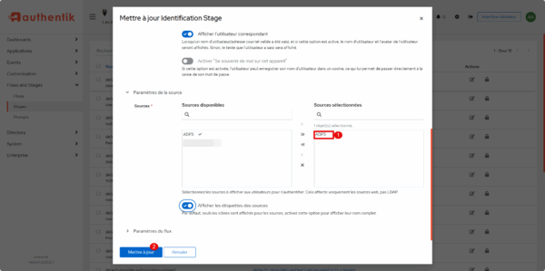 Dans les sources, ajouter ADFS 1 et cliquer sur Mettre à jour 2.