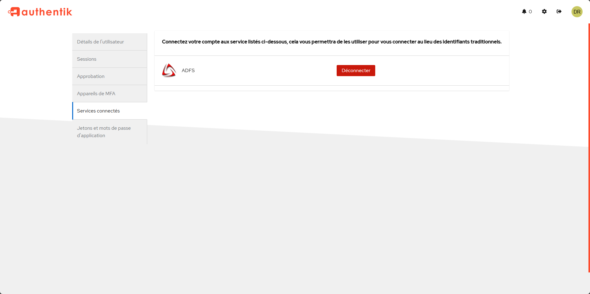 Si votre utilisateur est présent dans la base locale Authentik ou par une liaison Active Directory, on peut voir la liaison avec le service ADFS dans Services connectés dans les paramètres de l’utilisateur.