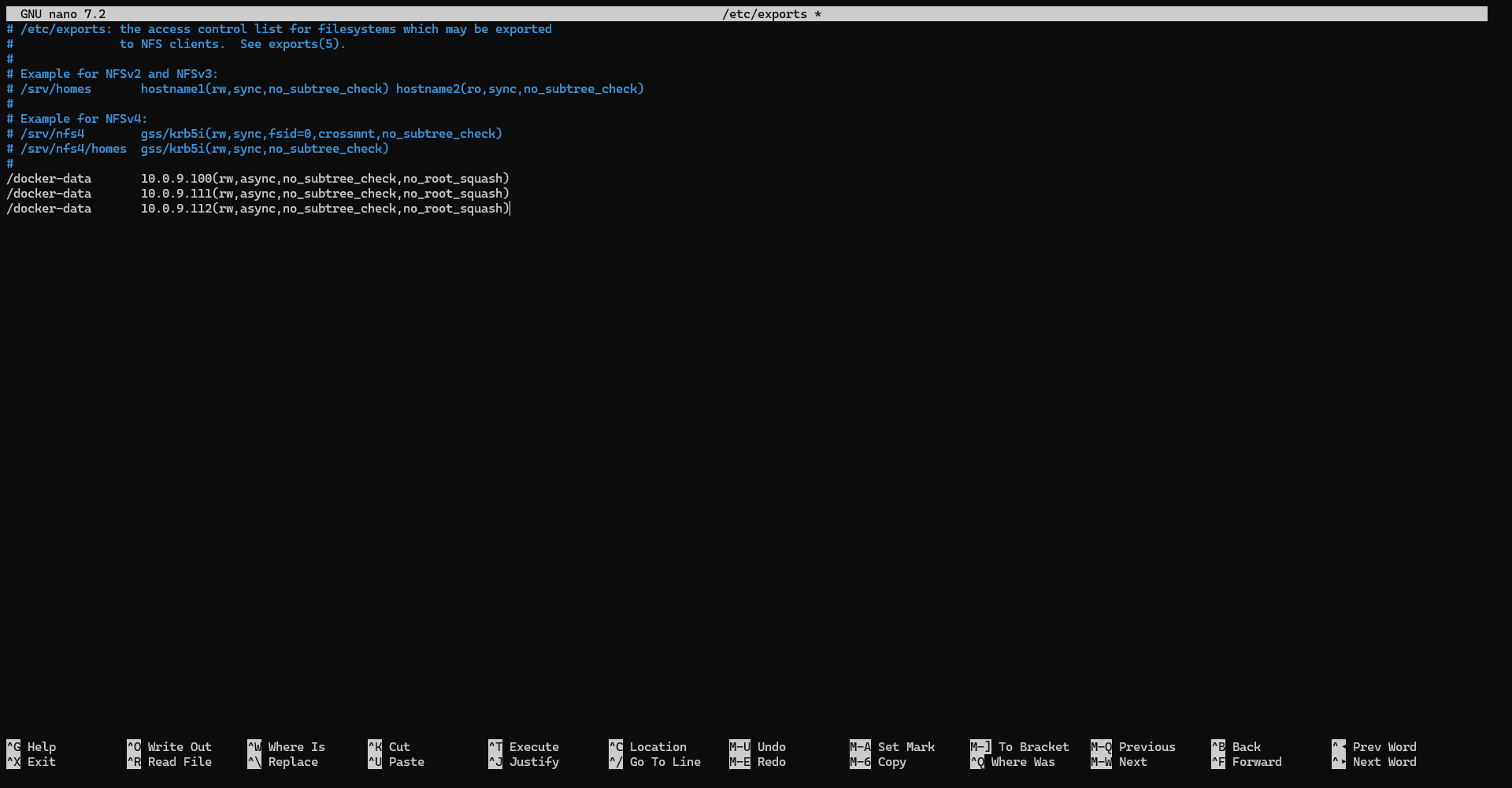 sudo nano /etc/exportsDans le fichier; il faut ajouter une ligne par nœud :