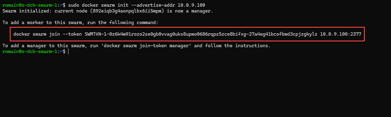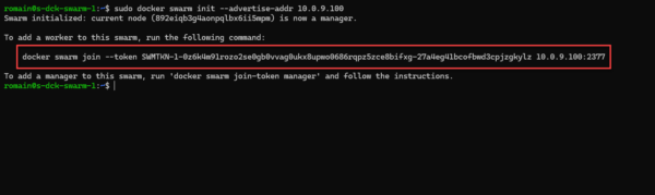 Sur le nœuds manager, entrer la commande suivante pour initier le Swarm :