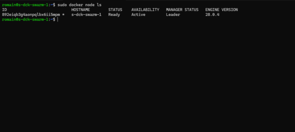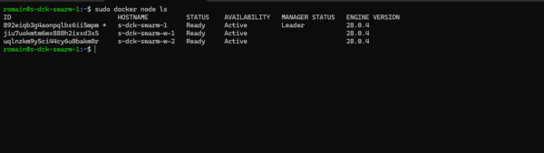 sudo docker swarm init --default-addr-pool 10.151.0.0/16 --advertise-addr ip-serverUne fois le Swarm initialiser vérifier les nœuds :