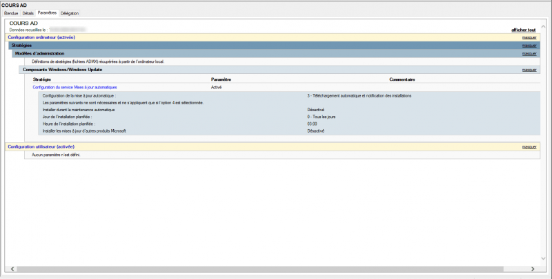 Afin de comprendre le placement, nous allons prendre un exemple. La stratégie COURS AD, qui va configurer Windows Update, qui est un paramètre Ordinateur.