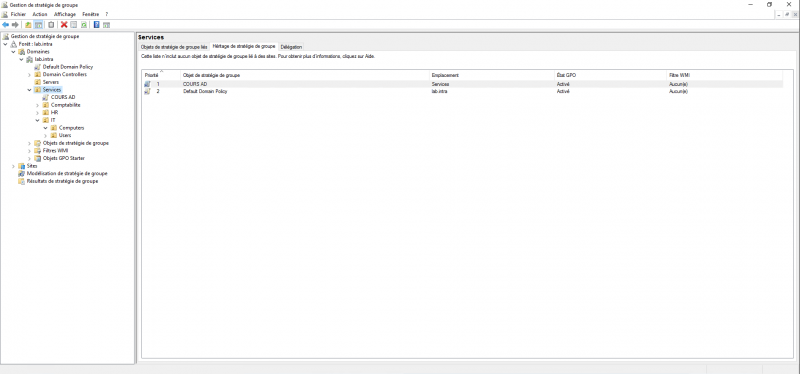 Dans cette configuration, la stratégie de groupe sera appliquée à l’ensemble des ordinateurs présents dans l’OU Services et dans les sous OU.