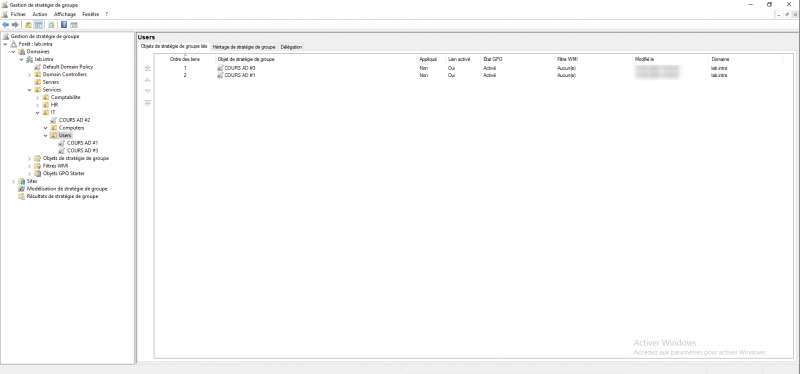 Dans cette configuration, la stratégie COURS AD qui est appliquée sur l’OU Services/IT/Computers (3-1) ne sera appliquée qu’aux ordinateurs de l’OU, dans l’exemple à l’ordinateur LAB-CLT3 (3-2).