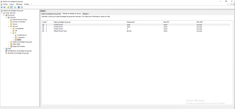 Les stratégies liées au plus proche de l’OU sont prioritaires sur les stratégies héritées, pour visualiser l’ordre de l’ensemble de stratégie, il faut se placer sur le conteneur et aller sur l’onglet Héritage de stratégie de groupe.