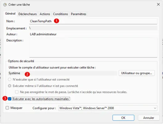 Auf der Registerkarte „Allgemein“ beginnen Sie mit der Benennung der Aufgabe 1, ändern den Benutzer, der die Aufgabe ausführt, indem Sie das Systemkonto auswählen 2, und aktivieren das Kontrollkästchen: Mit maximalen Berechtigungen ausführen 3.