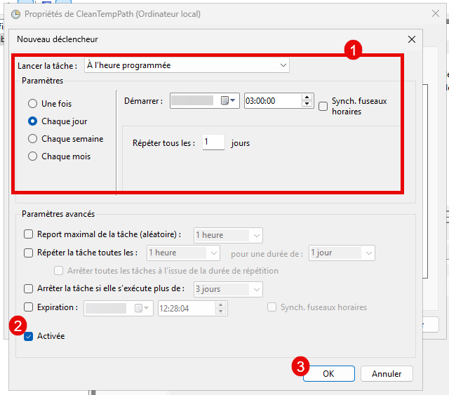Konfigurieren Sie den Zeitplan 1 (hier jeden Tag um 3 Uhr morgens), setzen Sie ein Häkchen bei: Aktiviert 2 und klicken Sie auf OK 3.